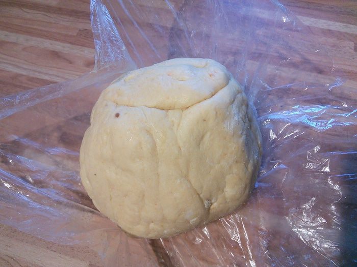 Выложите тесто на кусочек пищевой плёнки и соберите его в комок.