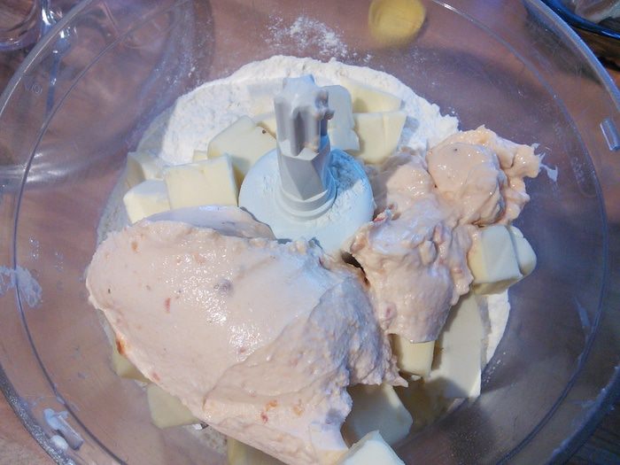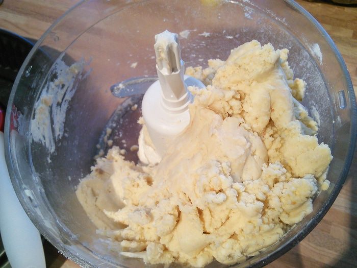 В блендере соедините муку, холодное масло, порубленное на кусочки, и творог, замесите тесто.