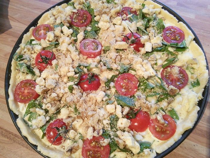 Залейте яичной смесью. Черри порежьте кружочками, распределите по кишу. Разогрейте духовку до 190°.