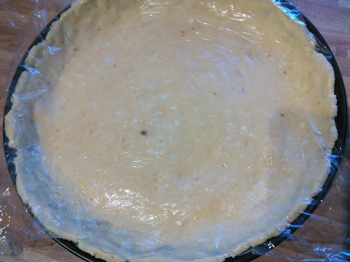 Смажьте форму для киша маслом и распределите тесто по форме, образуя бортики. Я распределяю его прямо под плёнкой, нажимая руками. Не убирая плёнки поставьте заготовку в холодильник.