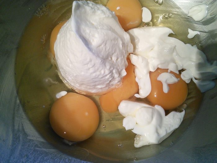 Для начинки цветную капусту промойте, разберите на мелкие соцветия и залейте на 5 мин крутым кипятком, так она сохранит свою структуру. Яйца взбейте венчиком со сметаной, посолите, поперчите.