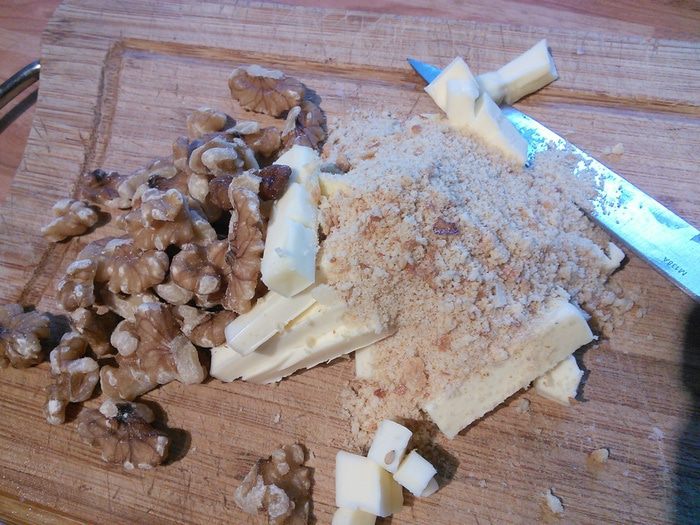 Для хрустящей посыпки соедините сухарную крошку с рубленными орехами и холодным маслом. Теперь следует это хорошенечко порубить и посыпать пирог ореховой смесью.