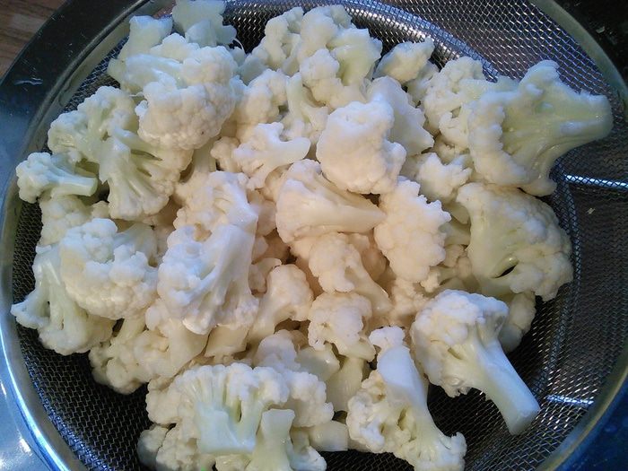 Цветную капусту охладите, предварительно слив с неё воду. Черемшу промойте, обсушите, порежьте и соедините с заливкой.