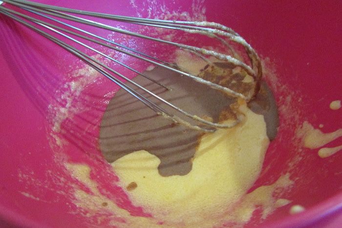 В желтковую массу добавить немного какао, размешать.