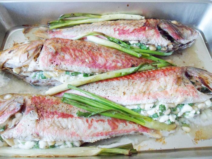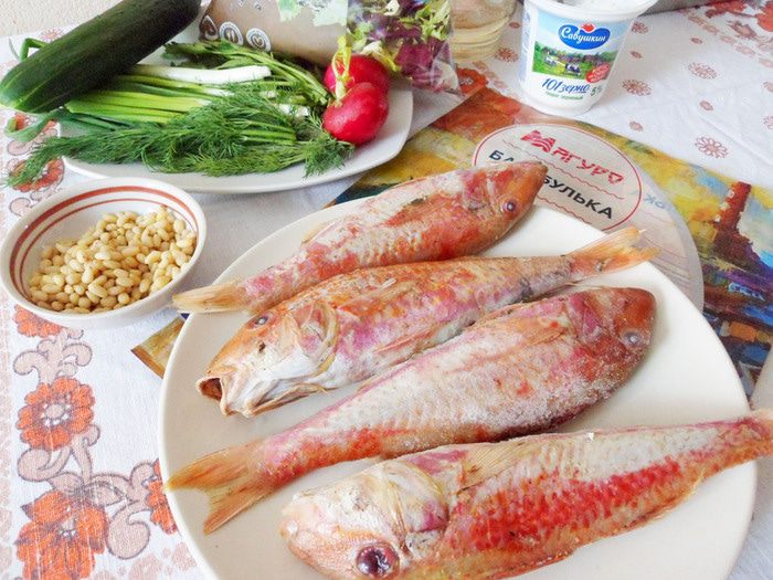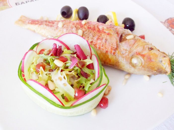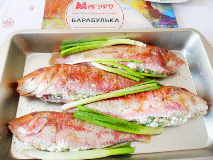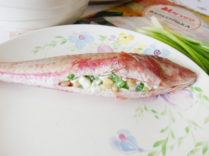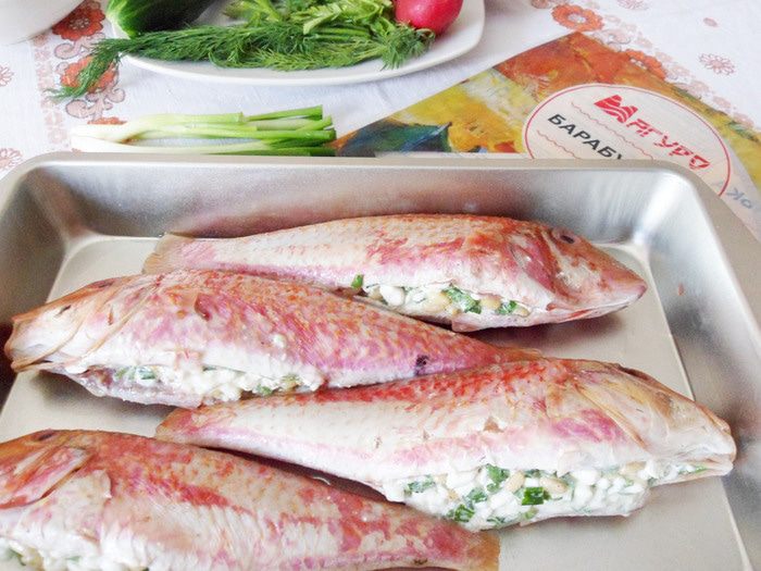 Рыба со смешным названием барабулька относится к роду рыб из семейства барабулевых. Что известно об этой рыбе? Среда обитания — Азовское, Черное и Средиземное моря. Тело у рыбки сжатое с боков и удлиненное. Рыбка по окрасу красноватая, брюшко светлое, а плавники желтенькие. Чешуя довольно крупная, но чистится легко. Не содержит желчи, поэтому ее можно не потрошить. Второе название рыбы — султанка. Связано с усами барабульки, довольно таки длинными, а раньше роскошные усы носили только султаны. Мясо барабульки деликатного вкуса и очень нежное. Еще она ценится за свой особый жир — он нежный, своеобразен по вкусу и имеет замечательный аромат. Предлагаю приготовить барабульку, фаршированную зерненым творогом. Все ингредиенты характерны для русской кухни — творог, кедровые орешки, зеленый лук, петрушка и рыба. Готовую барабульку подают горячей с легким овощным салатом и белым сухим вином с ароматом цветов и мягким послевкусием.