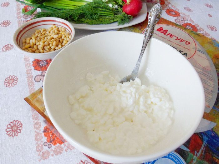 В глубокой миске размять зерненый творог.