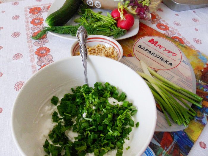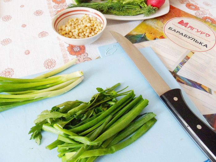 Часть перьев зеленого лука и несколько веточек петрушки мелко нарезать.