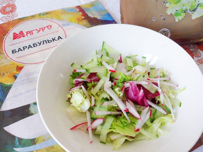 Пока барабулька запекается, можно подготовить легкий овощной салат. Я приготовила салатный микс с редисом и огурцом. Заправка — смесь гранатового соуса с оливковым маслом.