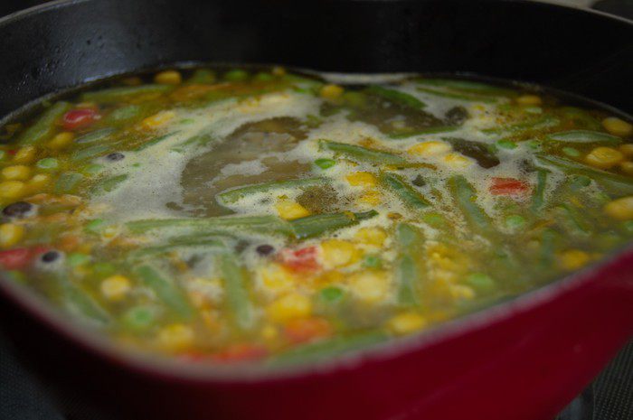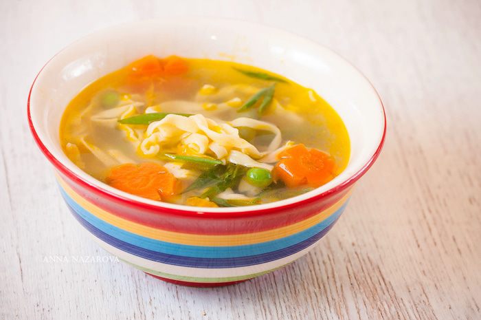 Теперь приступим к супу. Курицу (у меня была половина тушки, вес - около 1 кг) тщательно вымыть, залить холодной водой, довести до кипения, снять белую пену. В кастрюлю добавить одну луковицу, 1 лавровый лист, душистый горошек -5 шт. Варить до готовности курицы, в конце немного присолить. Извлечь мясо из кастрюли. Процедить бульон.