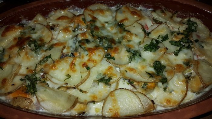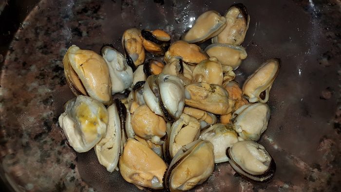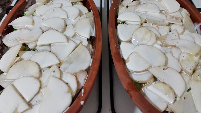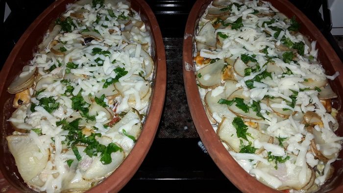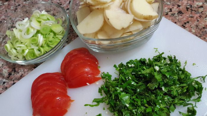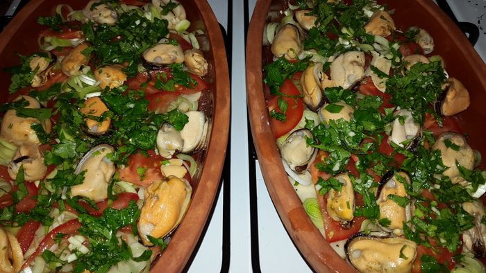Смазываем маленьким кусочком размягченного сливочного масла и выкладываем слоями половину картофеля, лук-порей, помидоры, распределяем мидии, посыпаем половиной зелени с чесноком, солим, перчим.