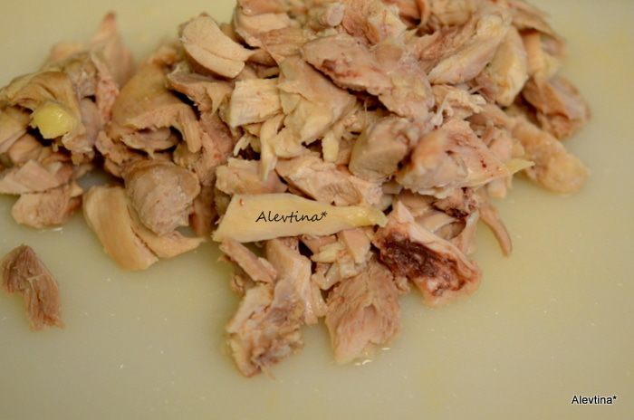 Затем куриные кусочки достанем шумовкой. Снимем кожицу, она нам не нужна, уберем кость и мясо порежем кусочками. У меня количество всех ингредиентов чуть меньше, чем по рецепту.