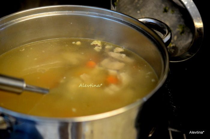 Вернем в процеженный бульон кусочки куриные, морковь, добавим суповые макаронные мелкие изделия и готовим еще, как сказано на вашей упаковке .