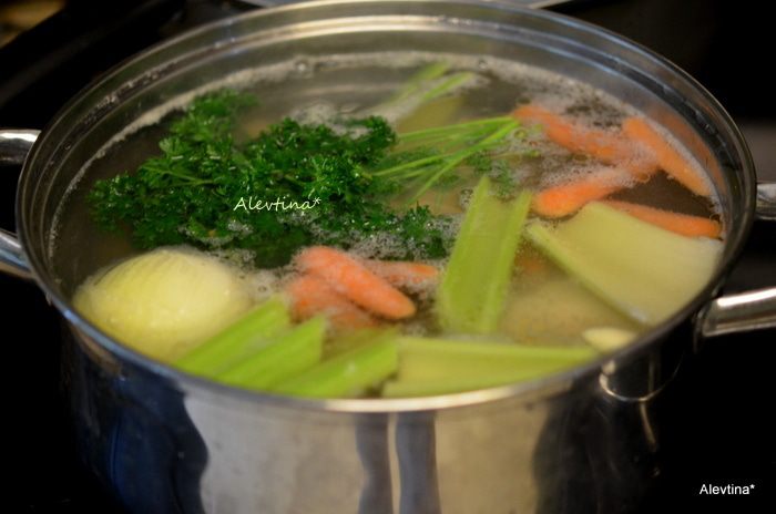 В кастрюлю сложить порезанные куски курицы на части, бульон, вода и соль 1 ч.л. Довести до кипения, снять пенку. Убавить огонь и добавить лук, чеснок, морковь, сельдерей порезанный крупно, пучок петрушки. Закрыть крышкой и варить 60 мин.