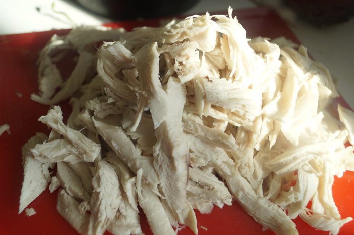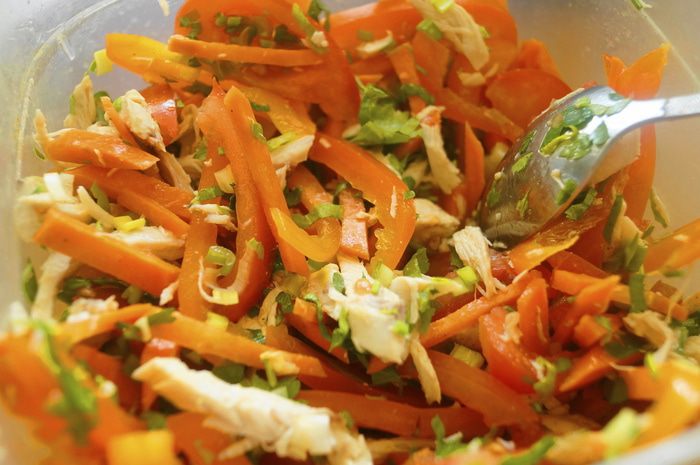 Отварное куриное филе нарезать соломкой.