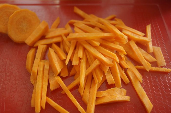 Морковку также нарезать тоненькой соломкой или натереть на терке для морковки по-корейски.