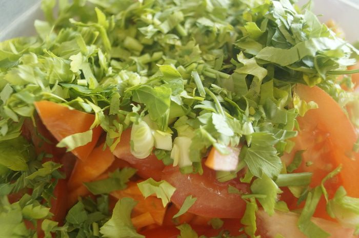 Затем к салату прибавить рубленную зелень петрушки.