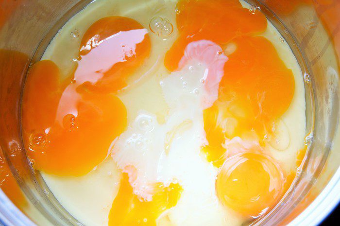 Все продукты должны быть комнатной температуры! Соединить яйца и сгущенку. На минимальных оборотах миксера взбить до однородности.
