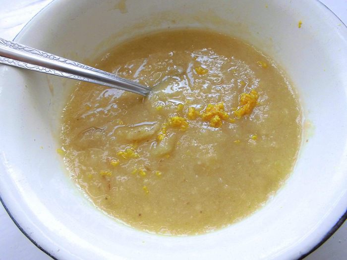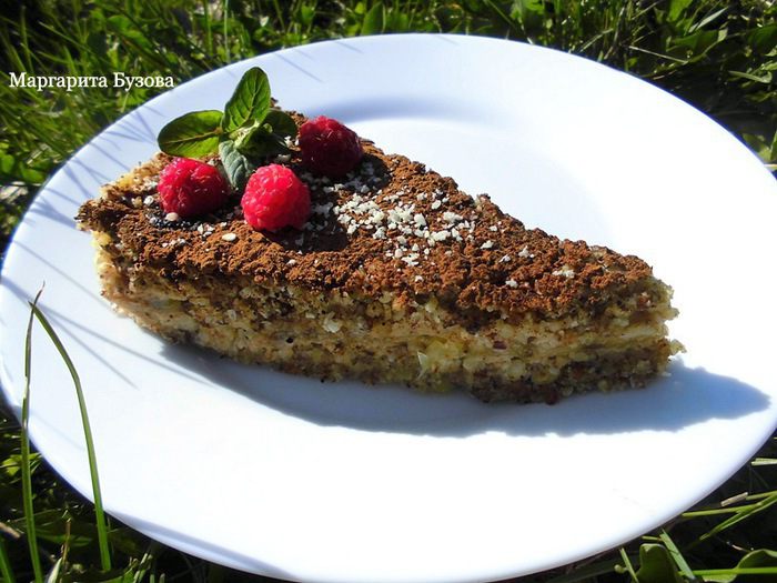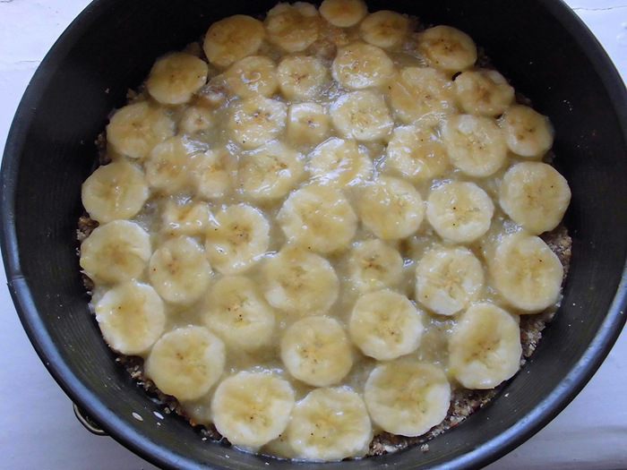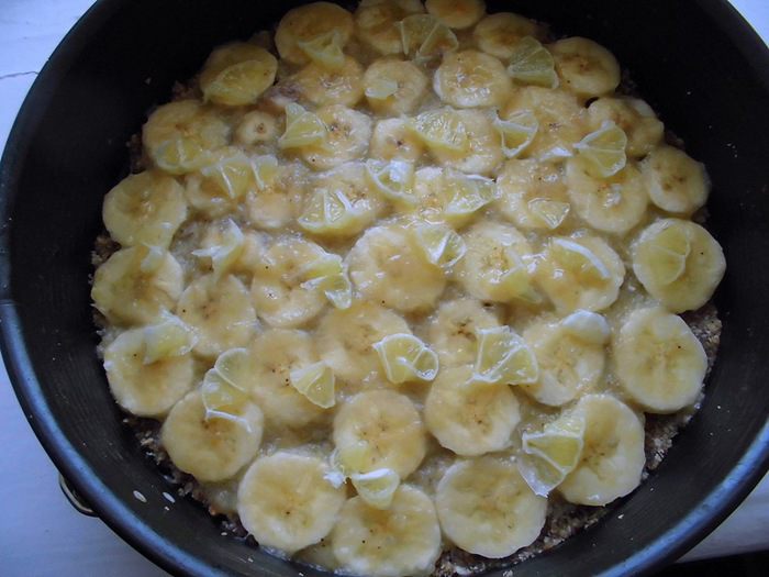 Оставшиеся 2 банана нарезать тонкими ломтиками (у меня они были очень тонкие, т.к. у меня было всего 2 банана, пусть и больших, но и форма тоже была большой). Лимон для прослойки я использовала поменьше, весом около 130 грамм. Очистить его от кожуры и перегородок, вынуть косточки и нарезать небольшими, тонкими кусочками. Я побоялась, что торт получится кислым, поэтому взяла чуть меньше половинки лимона. Но, когда уже ела торт, поняла, что нужно было добавить его побольше. На охлажденный корж выложить ломтики 1 банана, смазать его 1/3 соуса.
