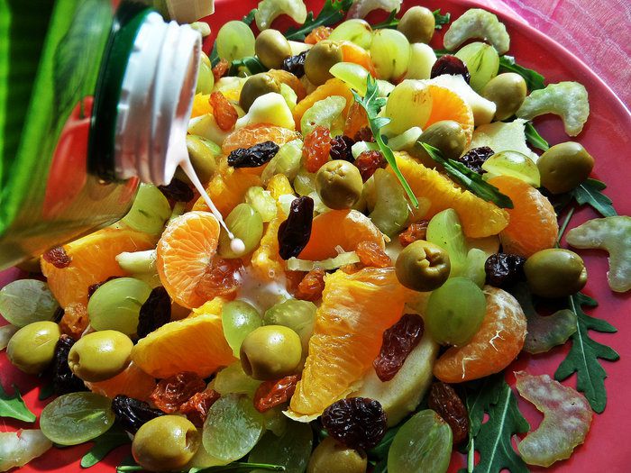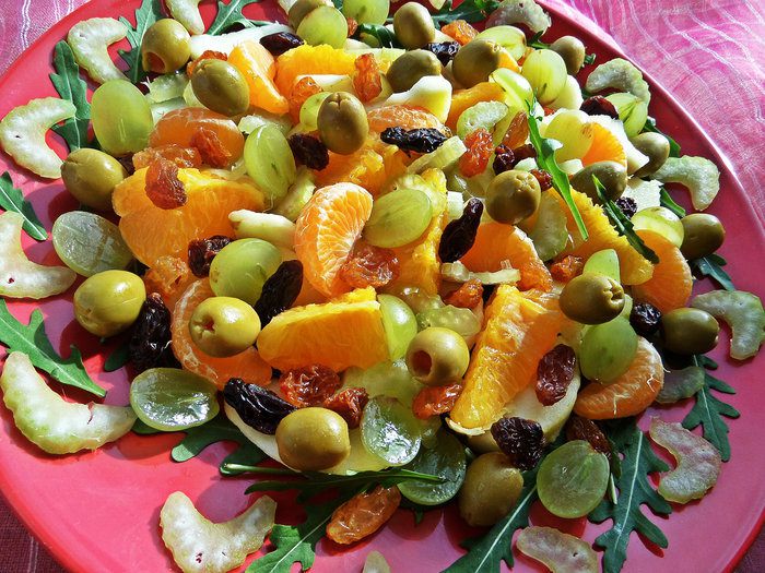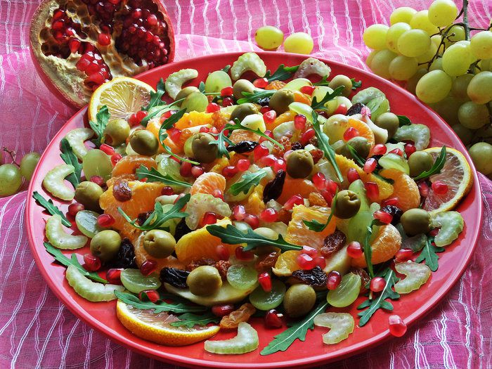 Осталось разбросать сверху половинки виноградин, зёрна граната и оливки для пикантности.