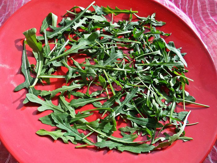 Рукколу покупаем уже чистую и разбрасываем по дну большого блюда.