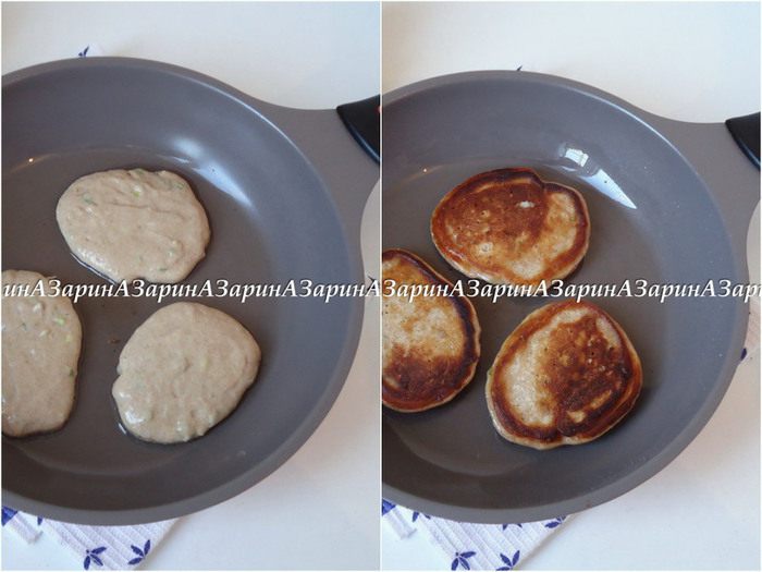 Жарим оладьи. Сковороду разогреть, добавить немного растительного масла. Выкладывая тесто ложкой, обжарить оладьи с двух сторон.