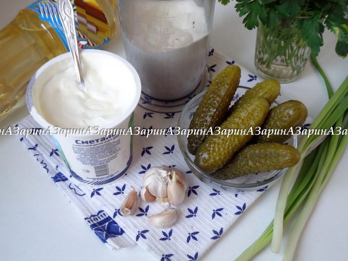 Теперь приготовить соус. Смешать сметану и майонез в равных пропорциях, огурцы мелко покрошить, добавить рубленую зелень, перец и пропущенный через пресс чеснок. Все хорошо перемешать.