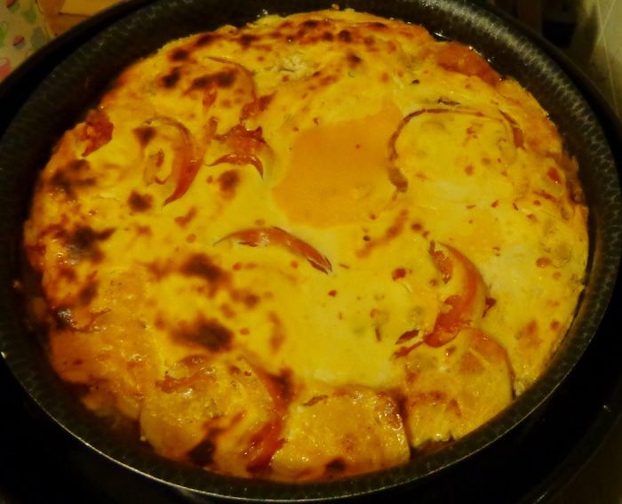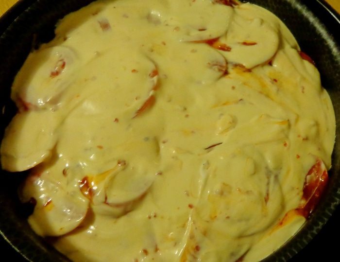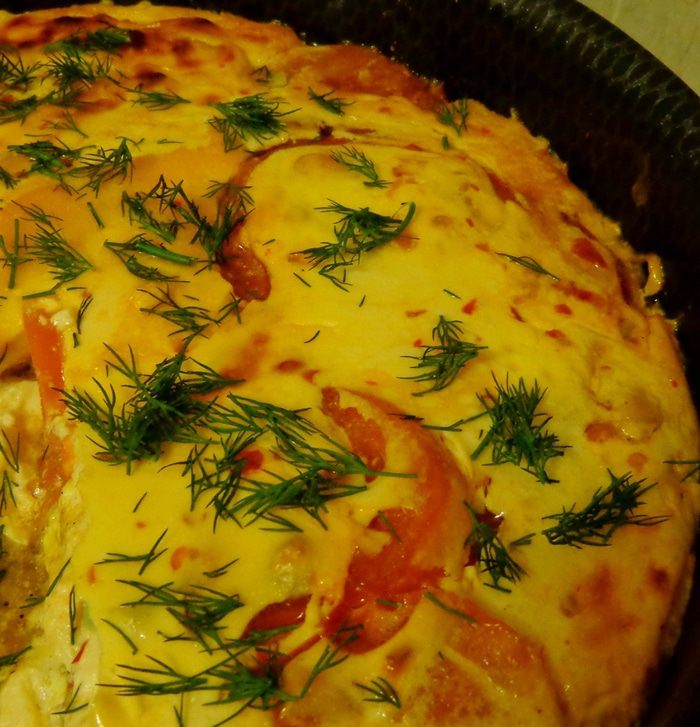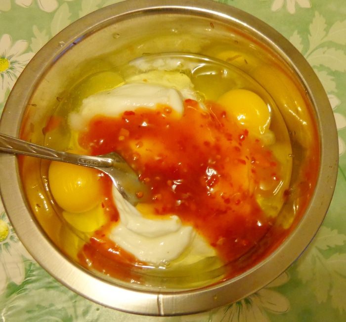 И вот пришло время заливки! 300 г крем-сыра смешать с 3 яйцами, измельченным чесноком, рубленой зеленью и сметаной. Посолить по вкусу. Для остроты положить какой-нибудь соус-чили.