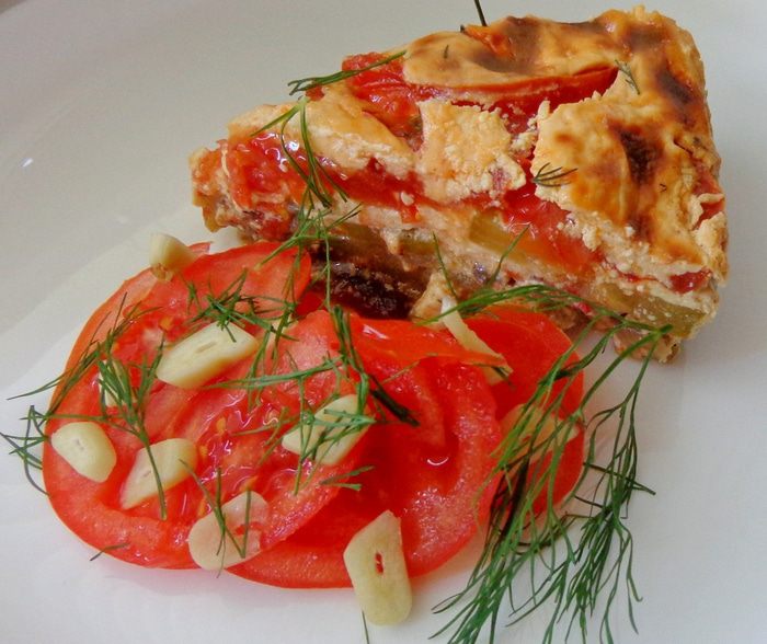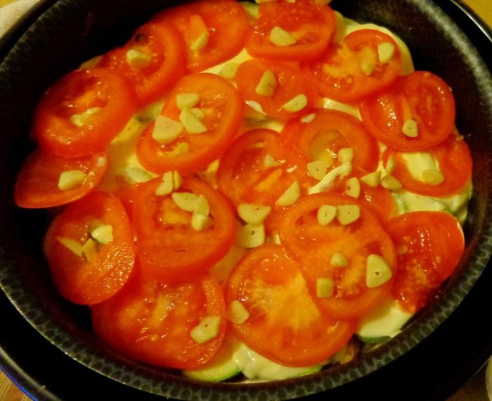 Сверху уложить нарезанные кружками помидоры и рубленый чеснок, посолить, поперчить.