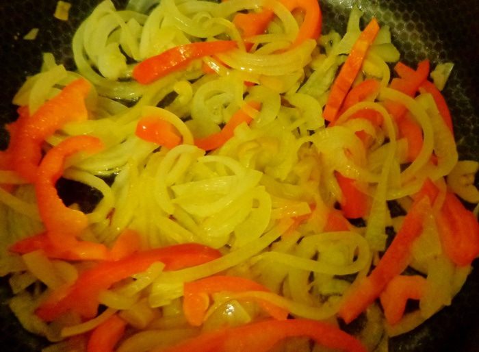 Обжарить лук с болгарским перцем и морковью