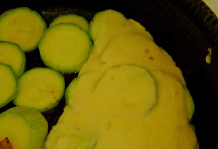 Вылить половину заливки на кабачки.
