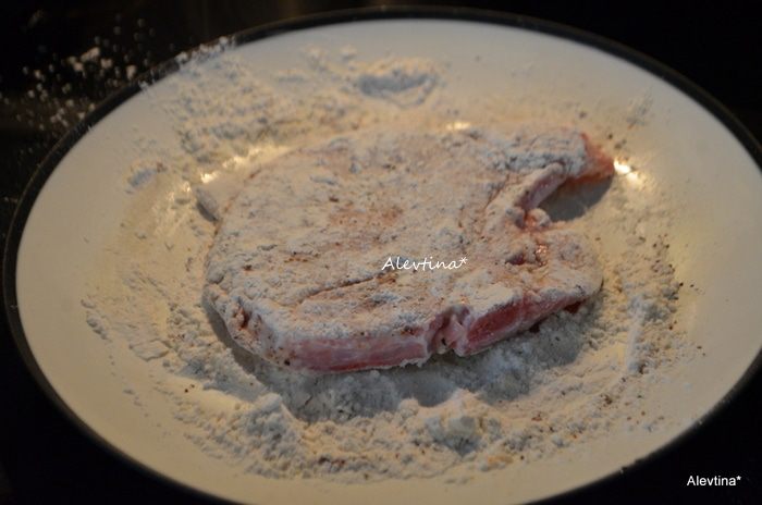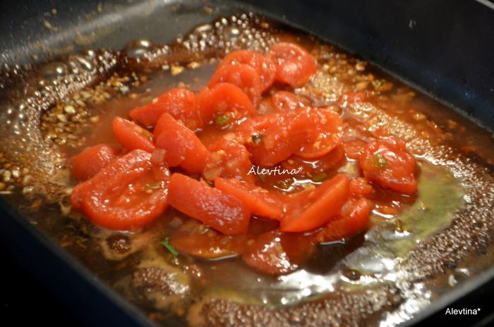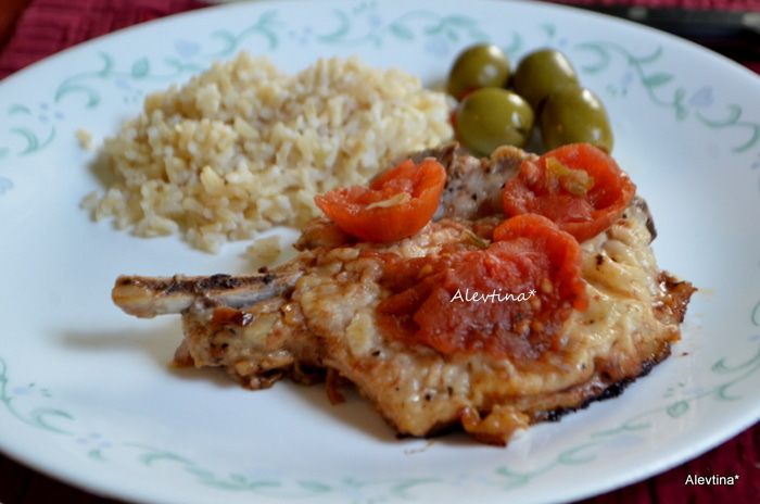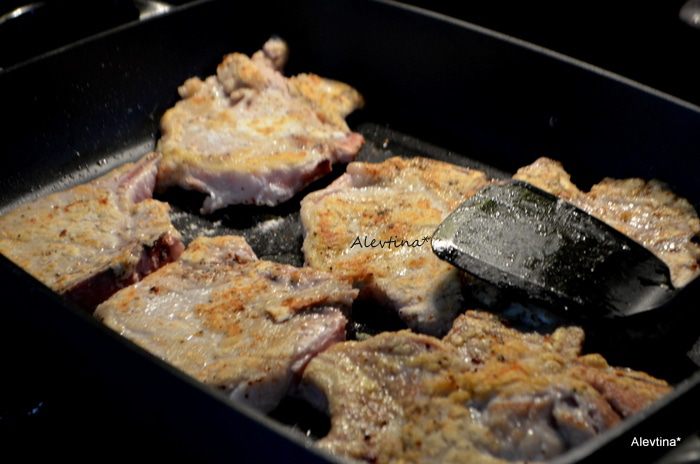 Добавить на сковороду очищенный и мелко порубленный или раздавленный чеснок, добавить бульон и уксус бальзамический. Вернуть свиные отбивные, добавить свежие нарезанные помидоры или баночные 400 г, каперсы. Готовить до готовности свиных отбивных, можно добавить бульон в процессе.
