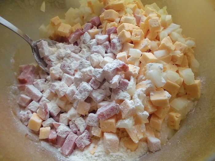 Зеленый лук вымыть, просушить и нарезать. Муку просеять вместе с разрыхлителем. Добавить нарезанную грудинку, сыр и лук. Тщательно перемешать.