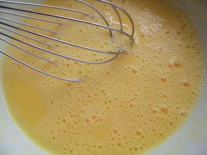 Яйцо взбить с молоком и подсолнечным маслом.