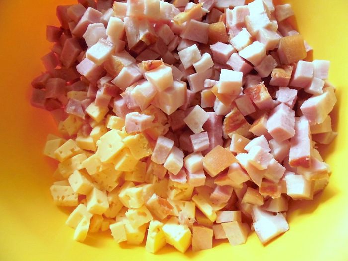 Духовку разогреть до 200 градусов. Сыр и грудинку нарезать крупными кубиками.