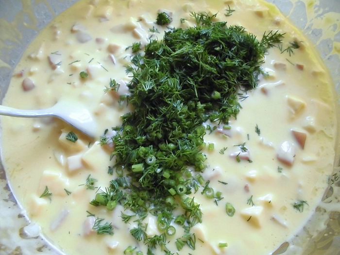 Влить молочно-яичную смесь, еще раз все тщательно перемешать. Форму для выпечки смазать маслом (если нужно) и вылить туда тесто. Выпекать 20-30 минут.