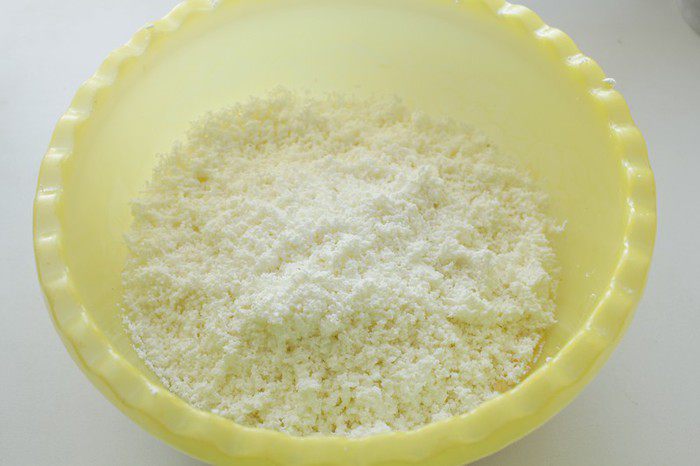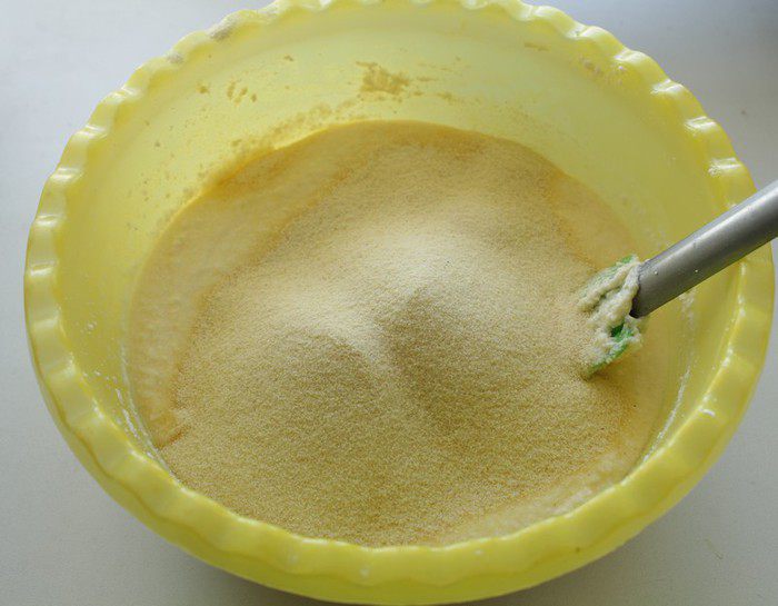 Манную крупу смешать с разрыхлителем и добавить к творожной массе.