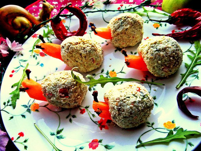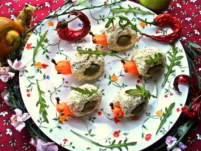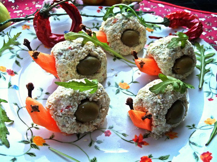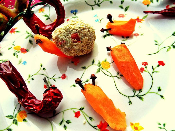 Головы из моркови получатся не сразу, надо потренироваться, но немного терпения и более-менее похоже на головки) Используйте тонкую морковь, я её держу очищенную в воде в холодильнике, поэтому она сочная и хорошо режется! Втыкаем в них осторожно рожки.