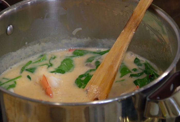 Когда суп будет практически готов, добавить креветки и шпинат, влить соевый соус, все перемешать.