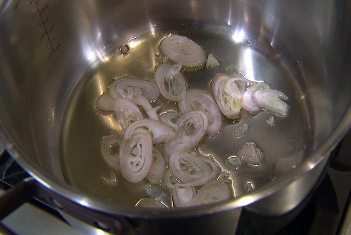 Разогреть в тяжелой кастрюле оливковое масло и обжарить шалот.
