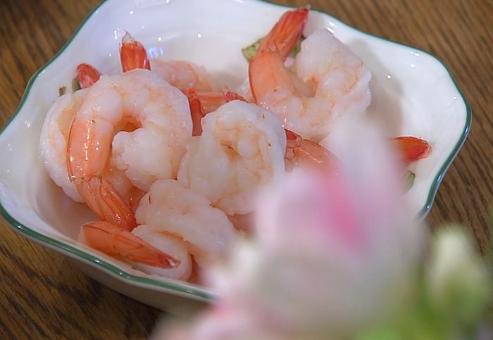 Креветки предварительно отварить и почистить.