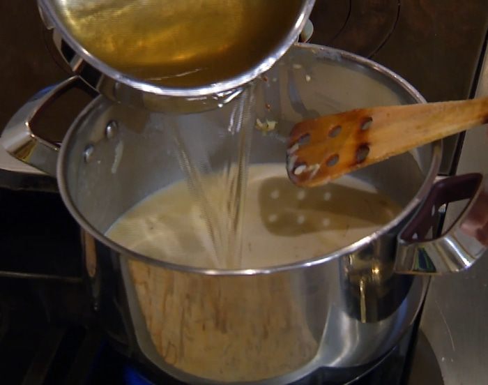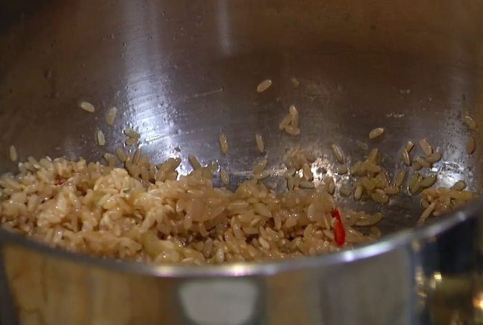 Влить литр горячего рыбного бульона, еще раз все перемешать и готовить на медленном огне 15 минут, подливая бульон по мере необходимости.