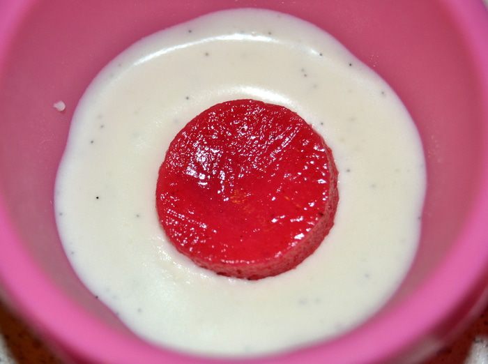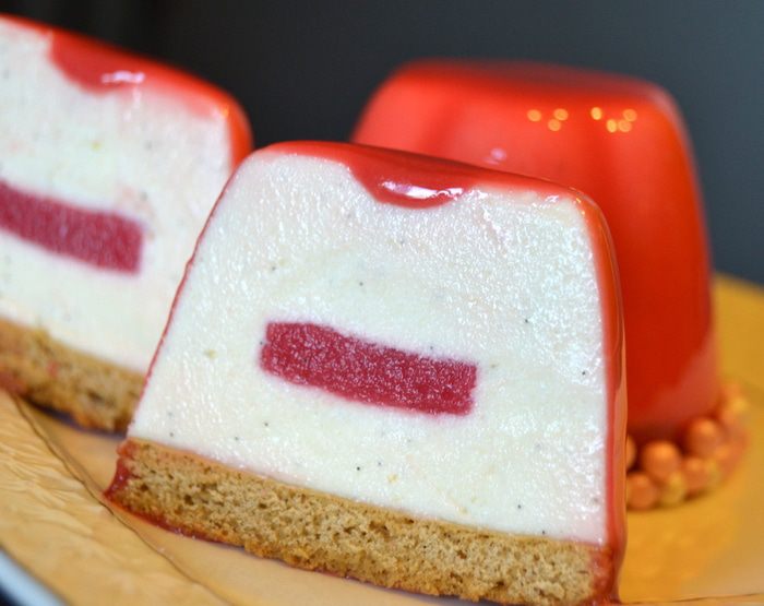 Предлагаю вам современный и модный в наше время десерт. Муссовое пирожное с глянцевой глазурью. Пирожное состоит из нежного ванильного мусса, кисленького смородинового конфи на ароматном медовом бисквите, а сверху зеркальная глазурь, если приглядеться, то можно увидеть отражение моего потолка с лампочками по кругу.