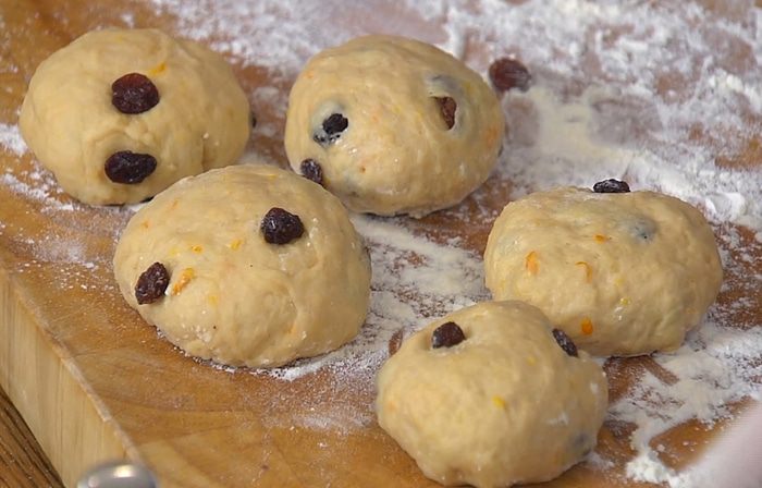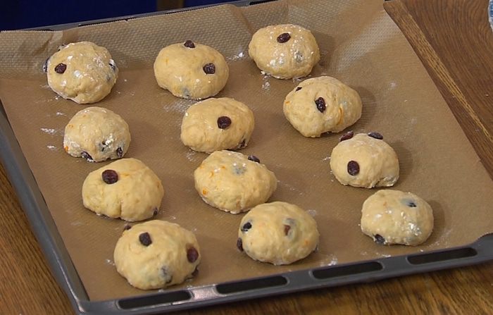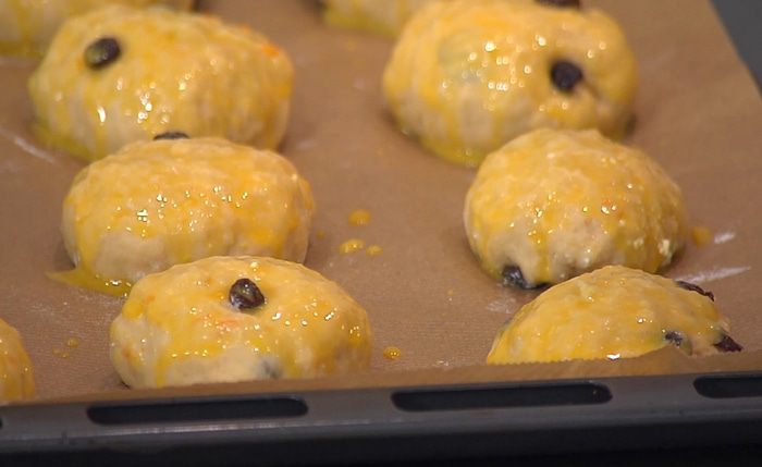 Противень выстелить бумагой для выпечки, выложить булочки, накрыть влажным полотенцем и оставить на 10–15 минут для расстойки.