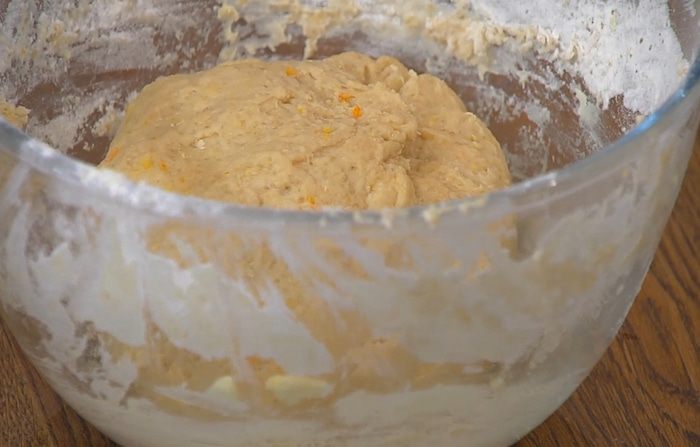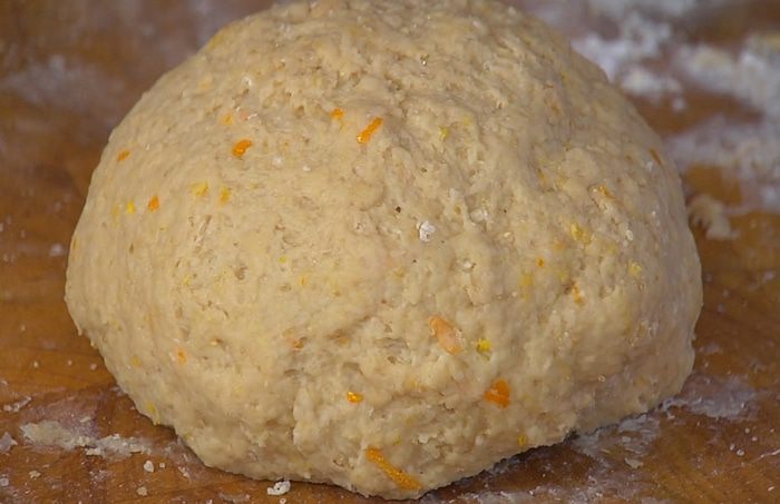 В глубокой посуде соединить натертое масло, цедру апельсина, всыпать 500 г муки, оставшийся сахар, добавить яйцо, соль и все перемешать.