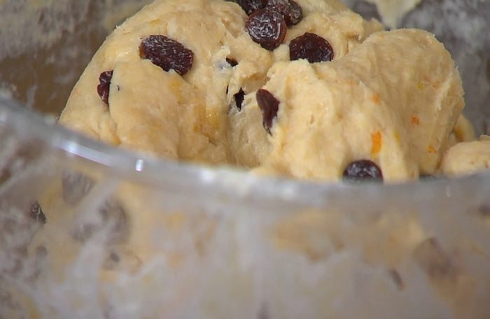 Изюм обвалять в 1 ст. ложке муки, добавить в подошедшее тесто и вымешать руками. Форму с тестом накрыть полотенцем, смоченным в очень горячей воде, и оставить тесто подходить еще на полчаса.
