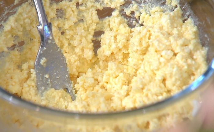 Приготовить начинку: творог соединить с желтком, сахарной пудрой, ванильным экстрактом, все посолить и перемешать.