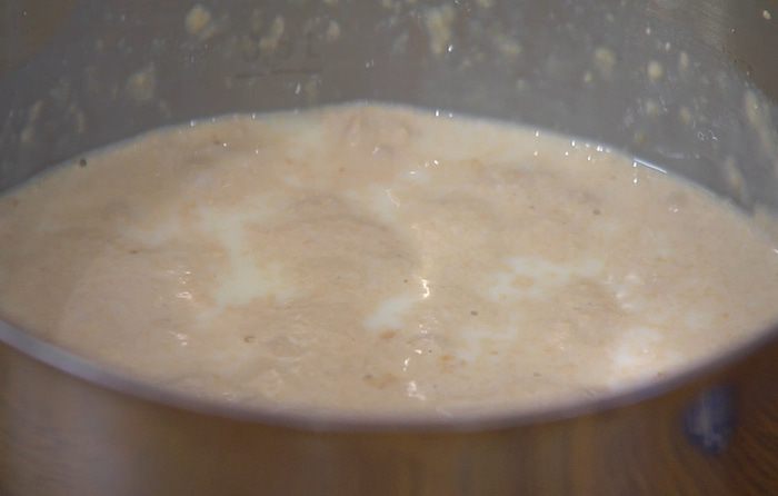 В теплом молоке развести дрожжи, добавить 1 ч. ложку сахара и дать дрожжам набухнуть.
