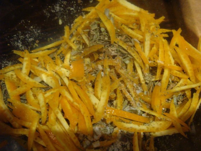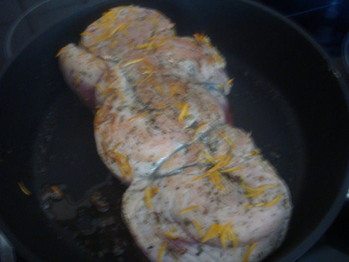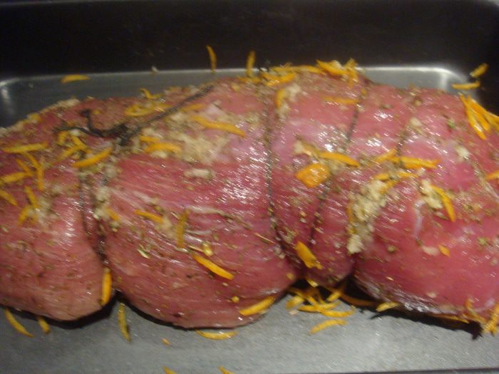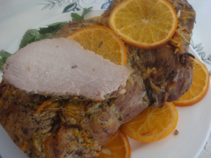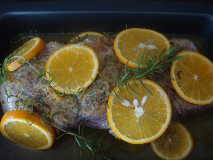 Мясо положить в жаропрочную посуду, залить апельсиновым соком и обложить порезанным апельсином. Положить пару веточек розмарина, лавровый лист, накрыть (фольгой) и поставить в духовку на 35-40 минут тушиться.