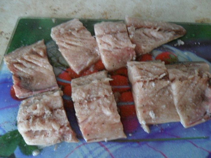 Каждое филе разрезать на четыре части. Посолить и поперчить.