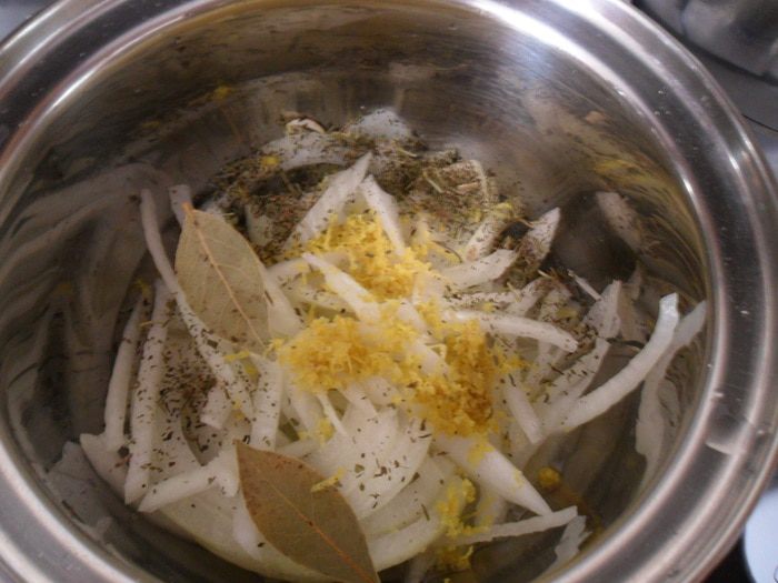 Добавить нарезанный полукольцами лук, цедру с половины лимона и половины апельсина, лавровый лист, подержать на огне 30 секунд.